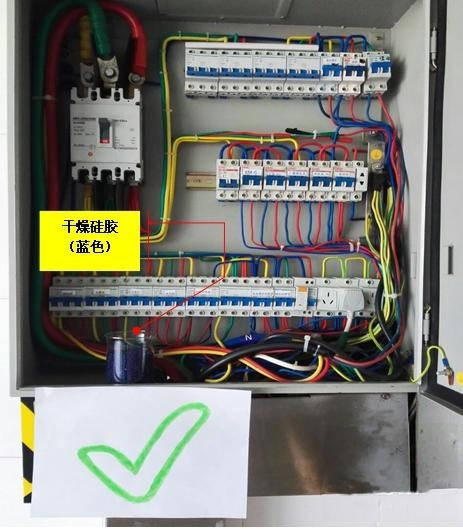陰雨潮濕的天氣,為了防止漏電、短路的事故發(fā)生,配電柜內(nèi)要存放干燥劑(硅膠),干燥的硅膠為藍(lán)色,受潮的硅膠為紅色,要及時(shí)更換。